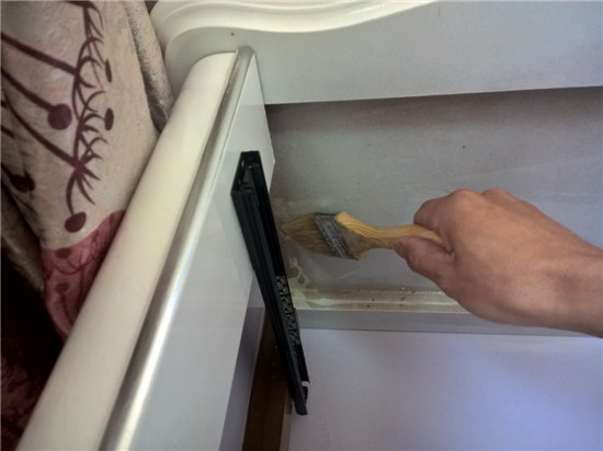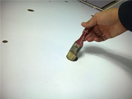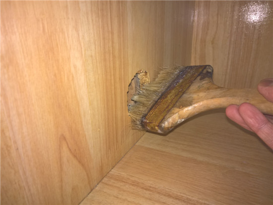 怎么使用呢?大家可以準備一把寬的羊毛軟刷,將所有人造板材柜體清潔干凈后,用羊毛刷蘸“立美凈”除醛凈味雙效觸媒均勻地涂刷在內柜體內部(家具外表不需涂刷),抽屜內外底板、床板及床頭后板等。對異味比較重的板材,待第一遍稍干了以后可再涂刷第二編,注意避免形成流淌,保持均勻即可。如下圖所示,釘眼、孔隙處都需要刷到。