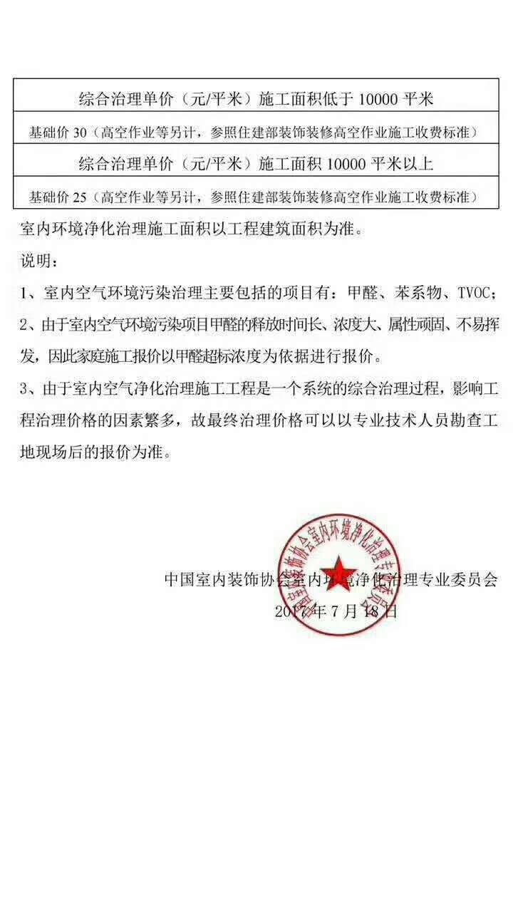 文件還參考了除甲醛施工環境、整體工程量等綜合因素來確定來工程甲醛治理收費標準,是一份權威、全面的甲醛治理收費標準參考文件。