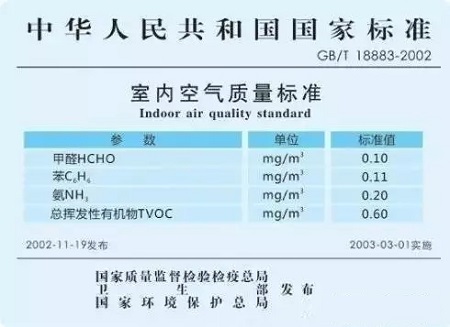 這個標準是由國家質量監督檢驗檢疫總局、衛生部、國家環保總局于2002-12-19發布,2003年3月1日實施的。在這個標準里,規定了室內甲醛濃度安全限值不得高于0.1毫克/立方米,是推薦性標準,非強制性標準。這個標準主要用于衡量人居室內環境健康的依據,在這個標準中不僅有甲醛、苯等裝修有害氣體,也對物理方面的溫度、濕度、PM2.5等都有規范要求,涉及到的指標有19項。